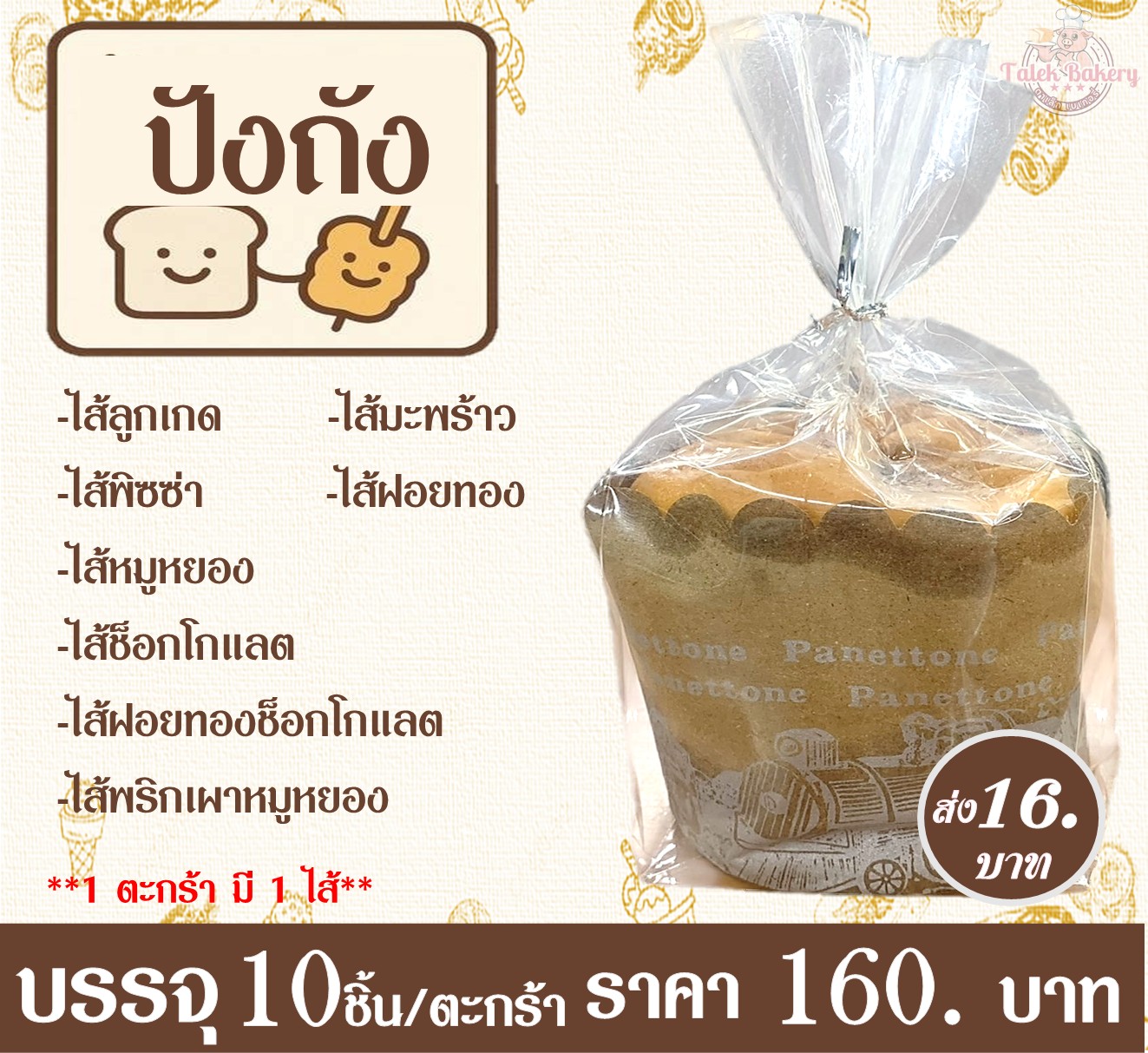 บรรจุ 10 ชิ้น/ตะกร้า ราคา 160 บาท ลูกเกด,พิซซ่า,หมูหยอง,ช็อก,ฝอย-ช็อก,พริก-หมู,มะพร้าว,ฝอยทอง