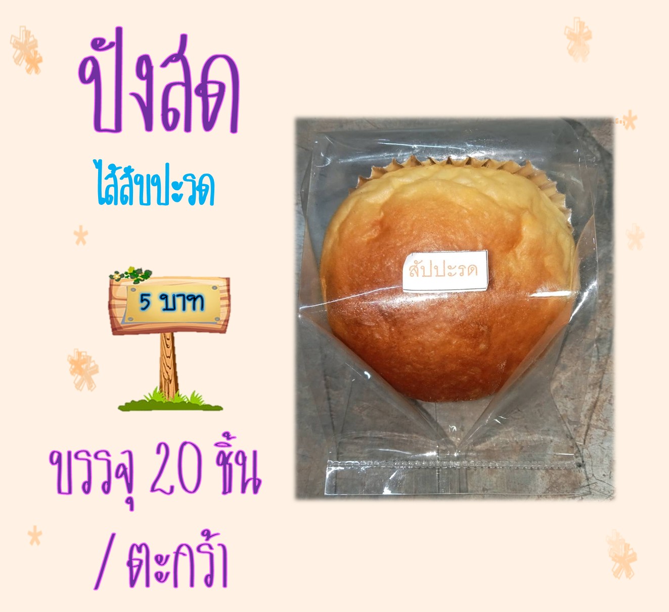 บรรจุ 20 ชิ้น / ตะกร้า ราคา 72 บาท สับปะรด,หมูหยอง,ใบเตย,เผือก,มะพร้าว,ลูกเกด,หอย,ปังยาว,ปังคู่ฝอยทอง,ปังคู่บลู&ราส