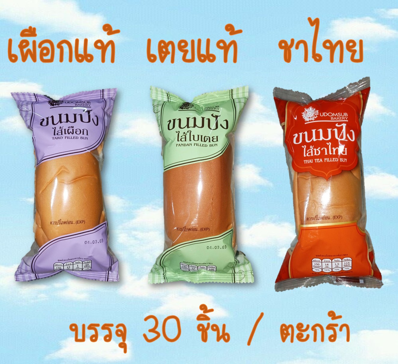 บรรจุ 30 ชิ้น / ตะกร้า ราคา 108 บาท // ไส้เตย , ถั่วเหลือง , เผือก , ถั่วแดง